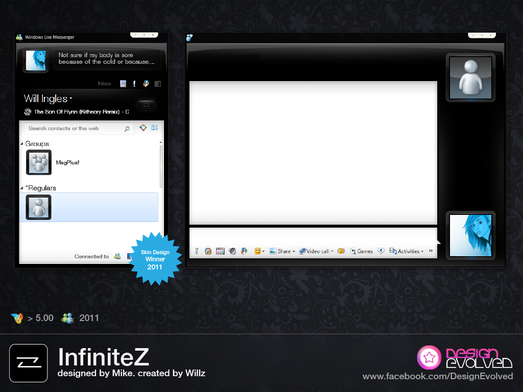 Precisamente, en esta ocasión queremos recomendarles InfiniteZ, un skin ganador del concurso de diseños para Messenger que se caracteriza por portar un color muy oscuro aunque sin llegar a ser en ningún momento algo tosco o molesto para la vista. De hecho, cuenta con un estilo muy minimalista y simple, acompañado de una buena combinación de fuentes tipográficas que seguramente serán bien vistas por los expertos en el diseño.